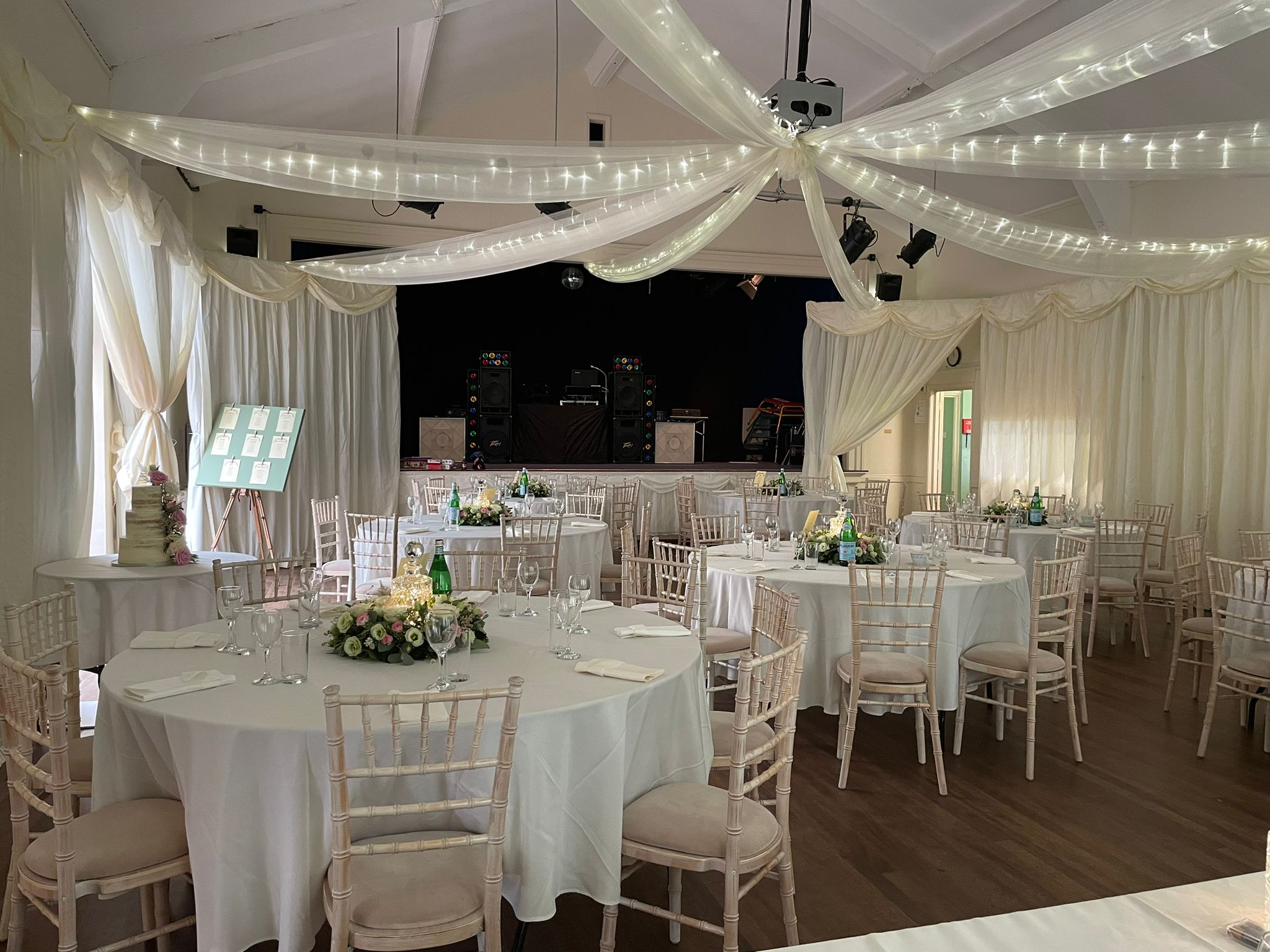 Whether you are going for a small, simple affair or something a little more extravagant, the hall provides a fantastic, flexible space and includes the necessary alcohol and music licences. A purpose built stage with star cloth backdrop provides a great setting for your entertainment and we can put you in touch with a company who will provide draping for a truly spectacular look. Wedding hires have access to the hall from midday on the Friday until midday on the Sunday, giving you plenty of set up and clear down time.